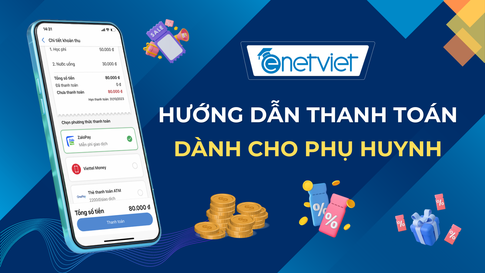 - Thành thạo các bước thanh toán học phí trực tuyến trên Ứng dụng eNetViet với đa dạng phương thức thanh toán: Zalopay, Viettel Money Thẻ ATM tài khoản ngân hàng, thẻ VISA…